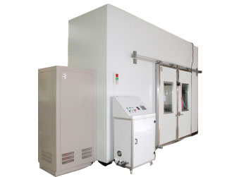 采用庫板房隔間方式對風(fēng)機單獨密封,隔音降噪。具有水溫溫度和室溫顯示,并具有室內(nèi)加溫裝置,保證在樣品溫度高于水溫10℃時,方可進行淋雨試驗。